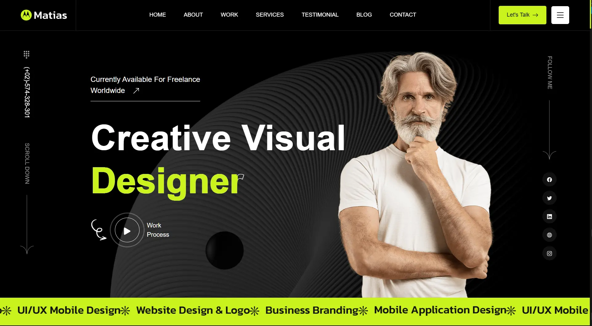 Minimalist portfolio for a freelance designer, highlighting UI/UX and branding services with wavy animations. Integrated a lead-gen app for project inquiries, streamlining freelance bookings.